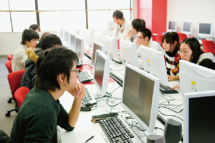 プログラマーやデザイナーをめざす学生とともにゲーム制作を行う授業も。プログラミングも学んでチームでの協働力を磨きます。