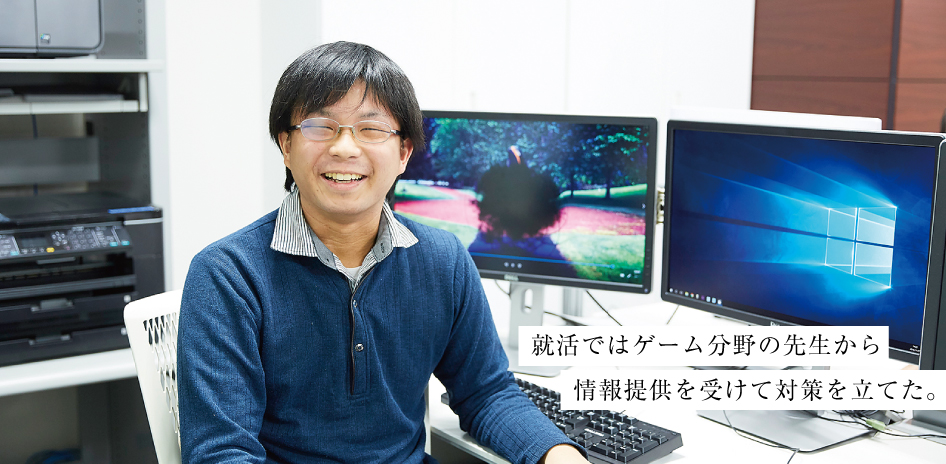 エフェクトを作成するデザイナー(VFX)として内定をいただきました。カプコンは業界のリーディングカンパニー。数多いゲーム会社の中でも、常にゲームのクオリティーをあげている会社だと思います。絶えずレベルアップを図るのは難しいことですが、僕もその環境で技術を磨き続けたいと考えています。先輩から技術を学び、ユーザーに満足してもらえるエフェクトをつくりたいです。