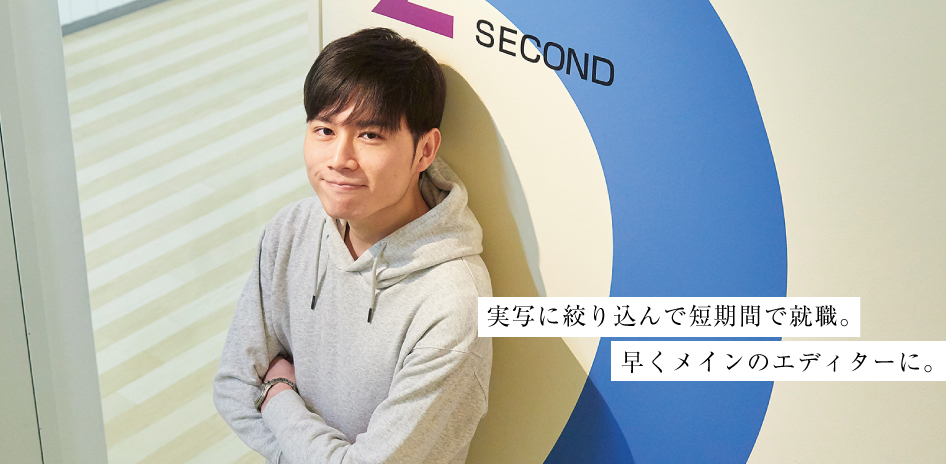 先生の紹介で受けた会社で、編集、加工などといった映像制作の最終工程を担当するポストプロダクションです。ディレクターが仮編集したムービーを本編集し、実際にテレビなどで放映される最終段階の映像をつくります。現場見学の機会があり、社の雰囲気を見てきました。自分の意見を言いやすい、風通しのよい組織だと感じました。僕も編集について積極的に提案できるよう、クライアントやディレクターとの信頼関係を築いていきたいと思います。最初はアシスタントからのスタート。なるべく早くメインのエディターになって、自分の色を出す仕事をしていきたいですね。