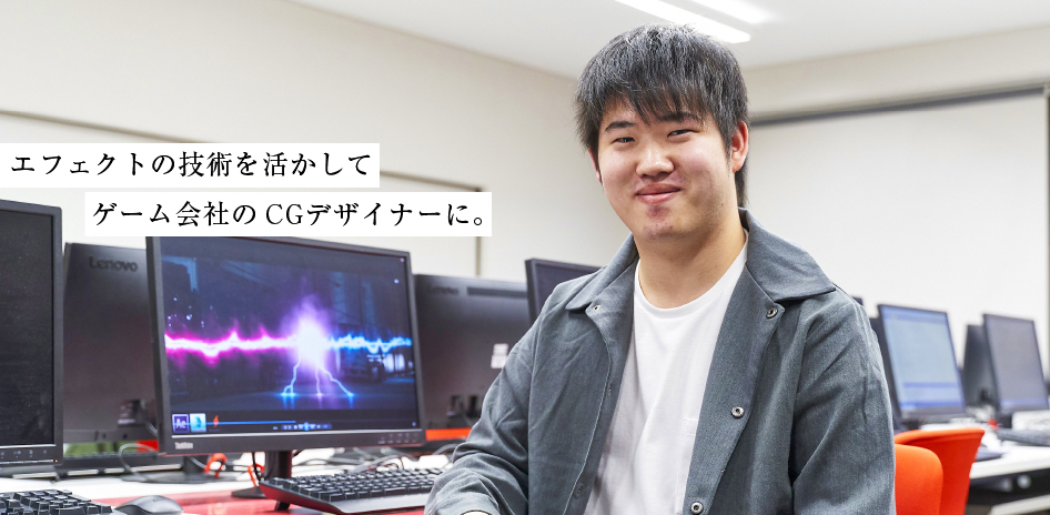 メインはゲーム開発で、これまでに「モンスターハンターシリーズ」や「戦国BASARAシリーズ」などの有名タイトルにも携わってきました。最初は映画関係のエフェクトをめざしていたのですが、学んでいるうちにこの技術がゲームにも使えると知ってゲーム会社をめざすようになりました。間もなく入社前のインターンシップが始まります。ゲーム業界の知識がないのでしっかりと学んで、ゲームユーザーに喜ばれるエフェクトをつくれるCGデザイナーになりたいと思います。