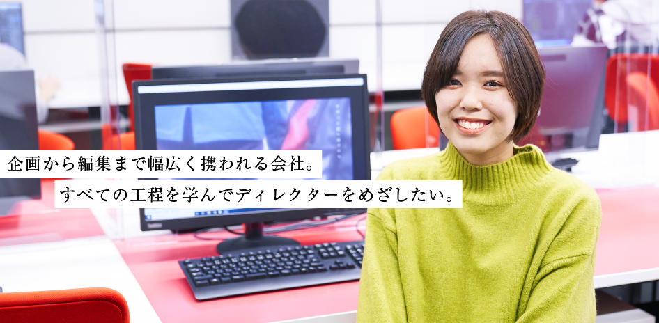 商品などのプロモーションムービーに強い会社で、企画から撮影・編集まで一貫して自社で手掛けることができる体制があります。編集がメインで全部の工程に携われる会社を探していた私にとって、企画から編集まですべてできる環境があるのは理想的でした。映像制作の全工程に通じたディレクター職をめざして、仕事を覚えていきたいと思います。