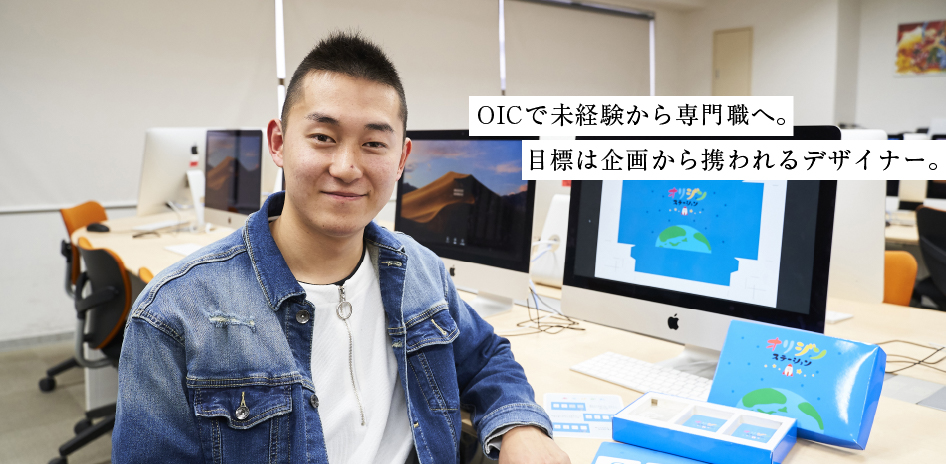 OICのオープンキャンパスでIllustratorを使う体験をして、楽しそうだと感じこのコースに入りました。入学してみて、やはり作品をつくる授業は楽しかったです。恵まれていたと思うのはOICの指導体制。高校のときのように、先生が一人ひとり向き合って教えてくださるので、わからないことでも最低限はできるように引き上げてもらえます。また、クラス全体で学ぶことも効果的でした。先生は皆の前で全員の作品を講評しますので、他者の作品に触れることで視野が広がりました。学生同士の教え合いも盛んでした。自分としてはいいと思ってつくった作品でも、そこに自分にない考え方をもらうことは勉強になります。クラスには入学時からすごくデザイン力のある学生もいましたが、ゼロからスタートした自分がこの短期間で専門職として就職できました。先生には感謝しています。