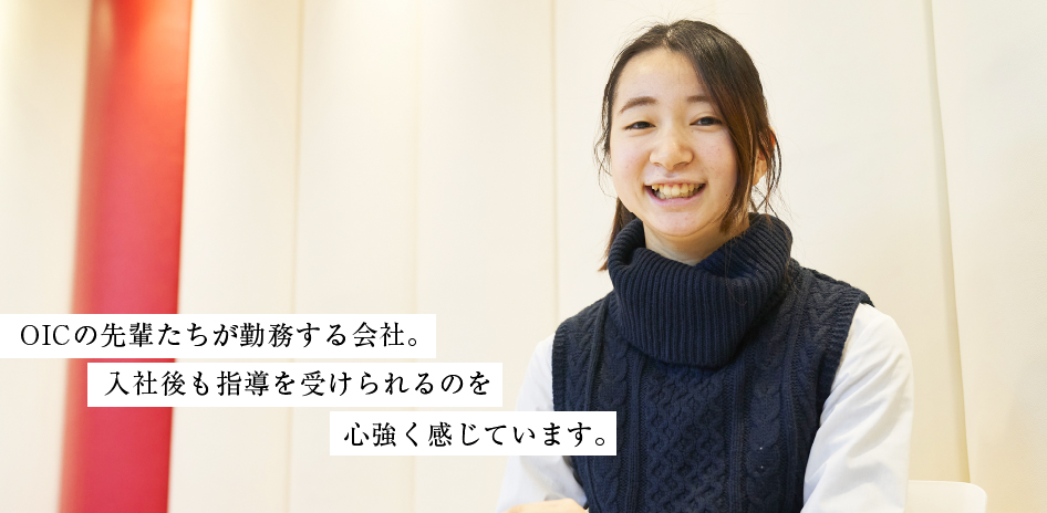店頭に並ぶ商品のパッケージなどをつくる会社で、OICの先輩たちも勤務されています。説明会で会社を訪問したときは雰囲気のよさを感じました。一人ひとりの方が真剣に仕事に取り組んでおられるのが伝わってきて、対応してくださった社員の方はとても柔和な笑顔で接してくださいました。働きたい職場だと思いましたね。私は人の日常生活の支えになるような仕事がしたいと思っていました。商品パッケージという消費者に近いものをつくる仕事というのは、まさにイメージ通りでやりがいを感じます。入社後はOICの先輩方が教育係として付いてくださることでしょう。本当に心強いことですし、期待に応えられる仕事をしていきたいと思います。