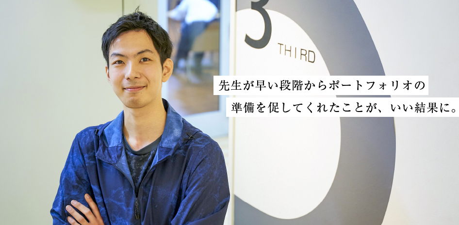 きっかけはOICの学内説明会でした。内定先の説明をお聞きしたとき非常にいい雰囲気で、明るい社風を感じ取ることができ興味を持ちました。その後1Dayインターンシップに参加する機会があり、その場でポートフォリオを講評していただき、すぐに面接のお話をいただきました。ポートフォリオで一番工夫した点は見せ方です。興味深い見せ方になっていないと冒頭しか見てもらえないケースもあるので、続きが見たくなるような作品の順序やレイアウトを考えました。これは先生から助言されていたことです。面接対策はゲーム業界に内定を決めていた友人に経験を踏まえて多くのアドバイスをもらったほか、先生に参加を促されたODCC(大阪デジタルコンテンツビジネス創出協議会)による模擬面接にも出て準備していました。
