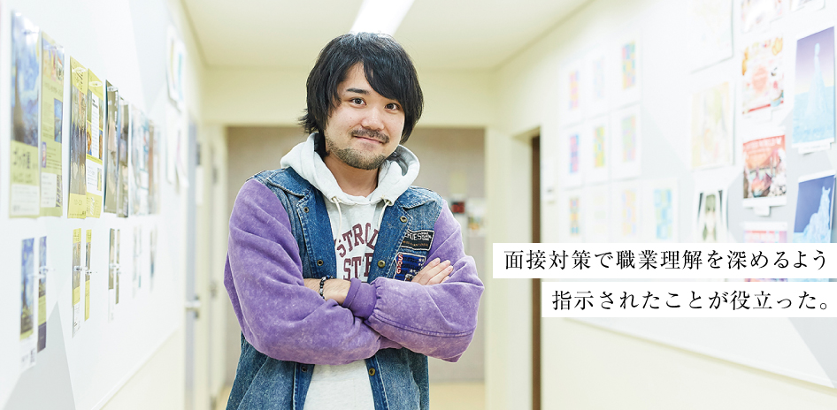 面接対策として、会社のホームページを一字一句覚えるくらい読み込みました。先輩社員の声もすべて目を通しましたし、売上げは1円単位で答えられるほど記憶しました。面接のスキルに関してはキャリア支援課と担任の先生にみていただきました。先生からは会社に関する勉強はよくできているので、あとは職種に対する理解を深めるよう指示がありました。それを踏まえ、システムエンジニアは開発面だけでなくお客様とコミュニケーションが求められるのが魅力だという自分なりの考えをまとめておいたのですが、これがうまくはまり、先生と一緒に準備をしておいたことがそのまま活かせた面接になりました。キャリアデザインという授業があり、普段から就職への意識づけはしてもらっていました。就活では自己分析も大切な要素で、僕は学生時代から今に至るまでのことを紙に書き出して振り返りました。これはキャリアデザインで学んだことの応用です。